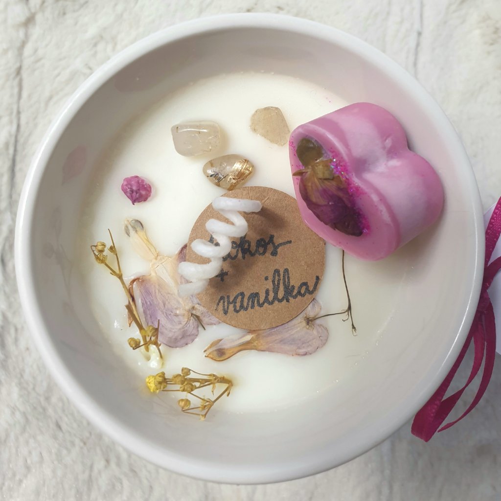 - Svíčka je ozdobená sušenými květy, křišťály a růžovým aromasrdíčkem → srdíčko obsahuje štědrou dávku magnoliové vůně, takže až se při hoření bude rozpouštět, nádherně provoní své okolí a obohatí vůni ještě o lehký zajímavý květinový podtón.